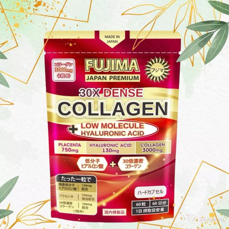 Состав: пептиды коллагена (содержат желатин производства Японии), порошковый экстракт свиной плаценты, декстрин / гиалуроновая кислота, желатин, микрокристаллическая целлюлоза, кальция стеарат, кремния диоксид, кальция фосфат, краситель (титана диоксид) - Низкомолекулярная гиалуроновая кислота 120 мг - Порошковый экстракт плаценты 14 мг (эквивалент 700 мг плаценты) - Пептиды коллагена 100 мг 〈В 1 капсуле〉 (эквивалент 3000 мг коллагена / пересчет для PO и OG) Плотный коллаген содержит в 30 раз больше уникальных для коллагена дипептидов PO и OG (пролилгидроксипролин и гидроксипролилглицин), чем обычный коллаген.