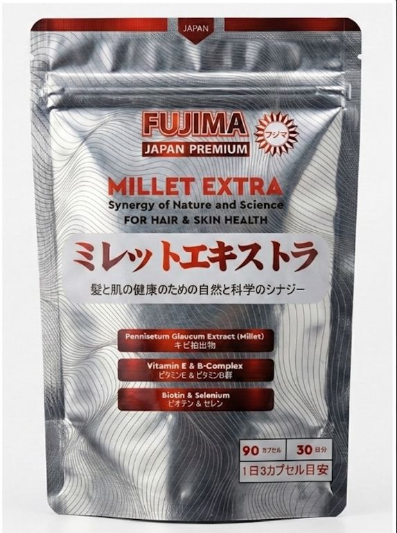 Откройте для себя FUJIMA Millet Extra — премиальную японскую пищевую добавку, созданную для тех, кто стремится к здоровью и сияющему внешнему виду изнутри. Этот уникальный комплекс объединяет силу древнего злака просо и современных нутриентов для одновременной поддержки ваших волос, ногтей и кожи.